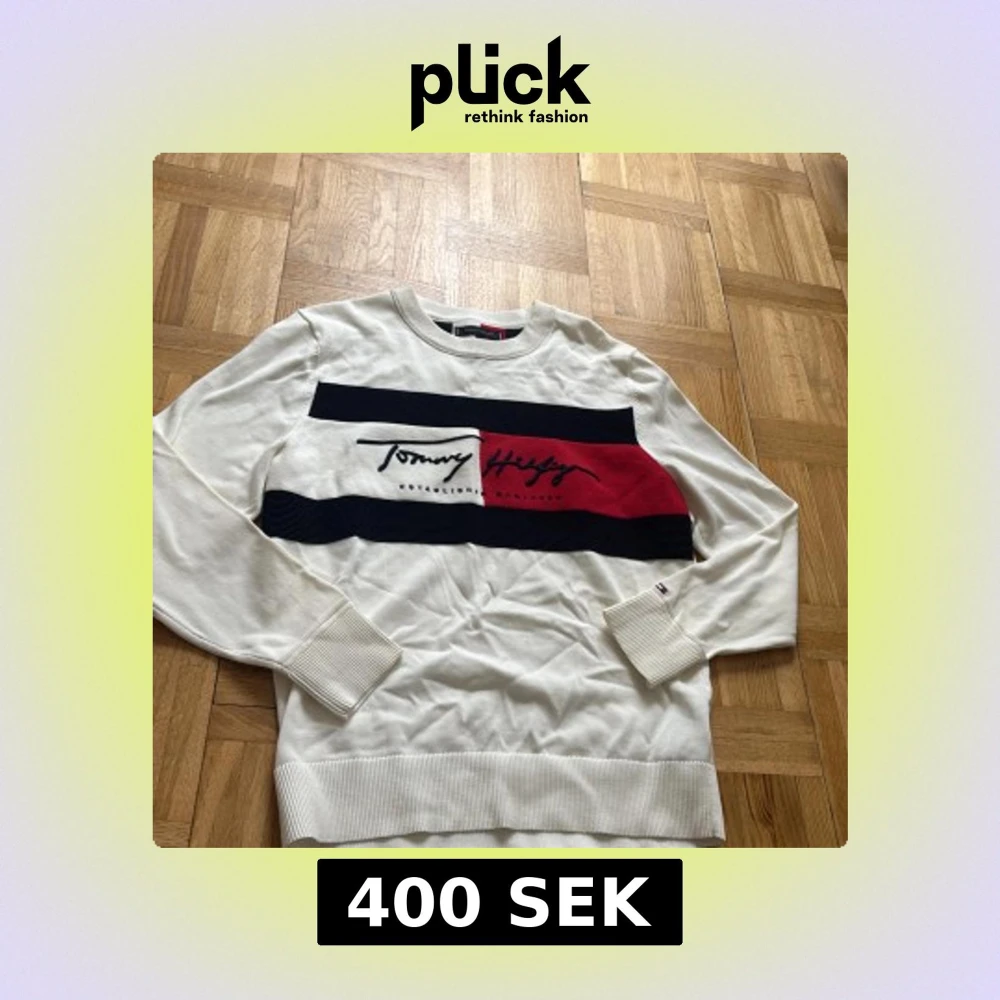 Snygg vit stickad tröja från Tommy Hilfiger i storlek S. Tröjan har långa ärmar, breda ribbade muddar och ett stort broderat logotyptryck i svart, rött och marinblått framtill. Perfekt för dig som gillar klassisk och stilren design.