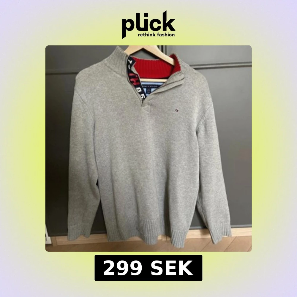 Säljer en stilren grå tröja från Tommy Hilfiger med dragkedja och ribbad krage. Tröjan har långa ärmar och mörkblå armbågslappar som ger en snygg kontrast. Perfekt för en avslappnad och trendig look.