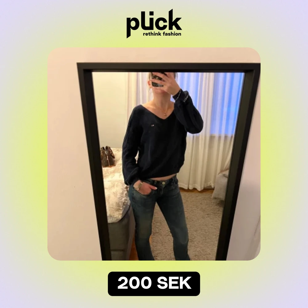 Stickad, marinblå tjocktröja från Tommy Hilfiger.perfekt längs till ett par långmidjade jeans för mig som är 162 cm