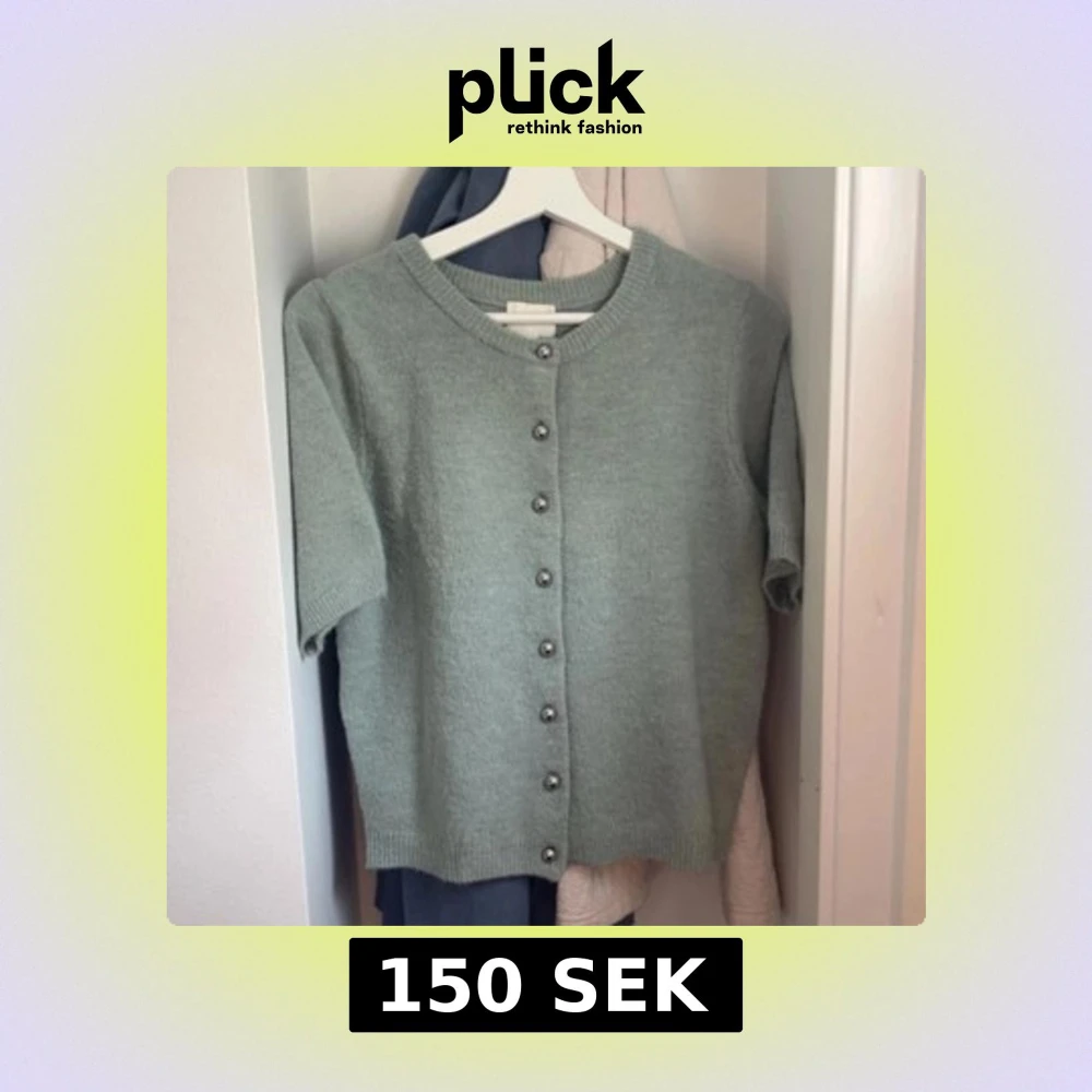 Superfin ljusgrön kofta med korta ärmar och pärlknappar framtill. Tröjan har rund halsringning och är stickad i ett mjukt material. Använd några gånger men är i jättebra skick