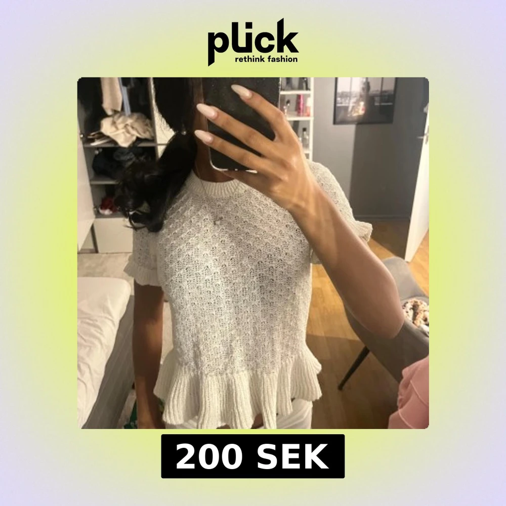 Supersöt vit stickad blus med korta ärmar och volangkant nertill. Den har en rund halsringning och ett fint, diskret stickat mönster. Perfekt för dig som gillar en romantisk och feminin stil.
