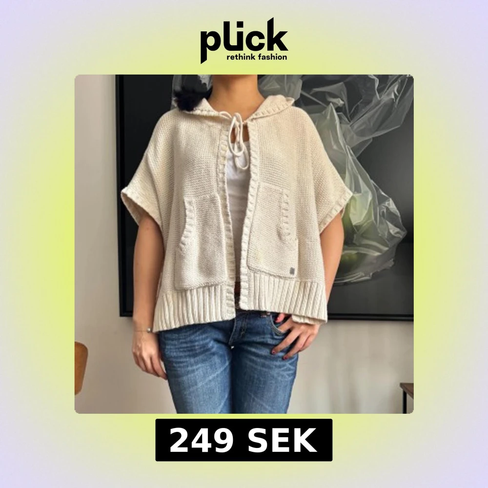 Gullig stickad ponchođ smĂ„ defekter och flĂ€ckar som man kan se pĂ„ bilderna