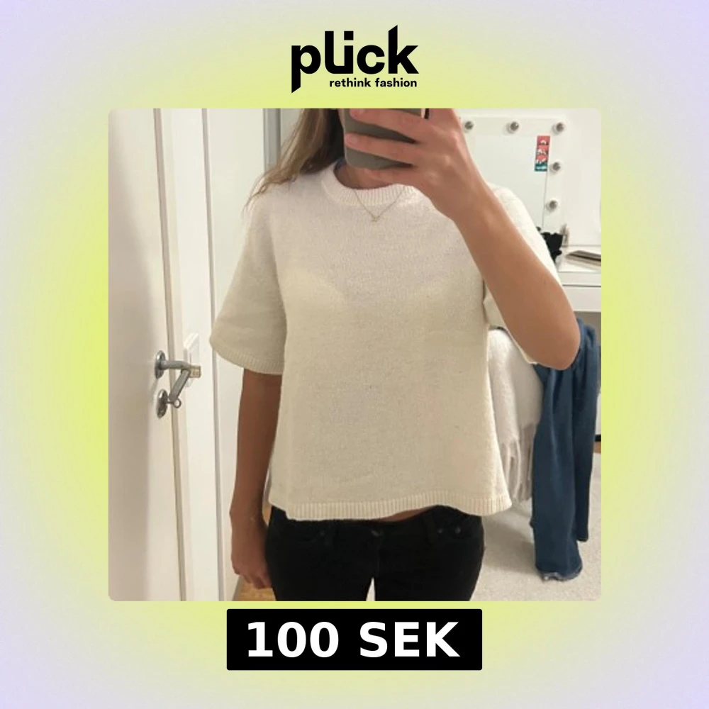 Säljer en vit stickad tröja med korta ärmar och rund hals. Tröjan har en loose passform och är perfekt för dig som gillar enkel och clean stil. Ribbad kant vid hals och nederkant ger en snygg detalj. Passar till både jeans och kjol.