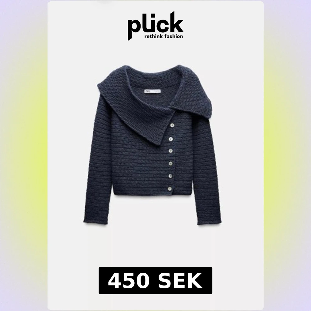 Snygg mörkblå stickad kofta från Zara med bred krage och dekorativa knappar framtill. Koftan har ett ribbat mönster och är långärmad, perfekt för att ge din outfit en cool touch. Passar dig som gillar stilrena detaljer och vill ha något extra.
