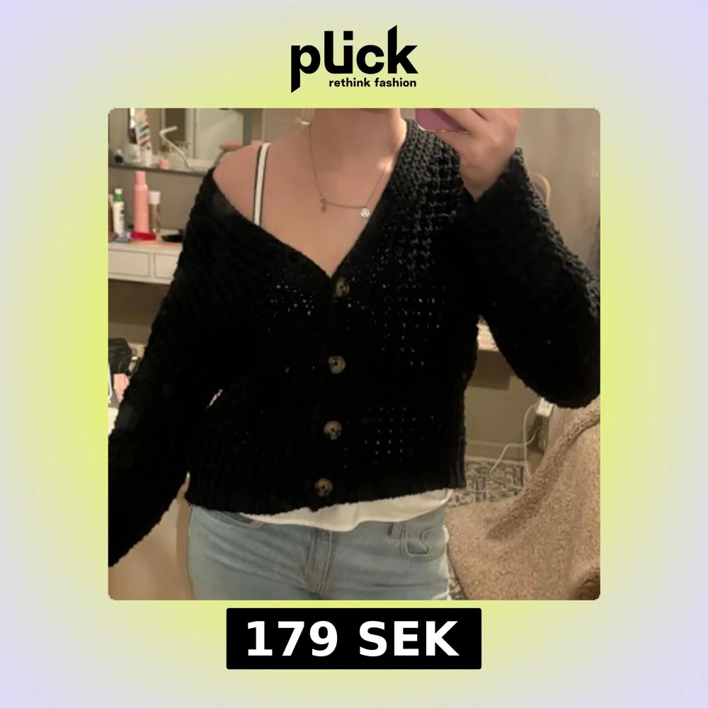 Mysig svart stickad kofta med grov struktur och fyra stora knappar framtill. Koftan är croppad och har lång ärm, perfekt att slänga över ett linne eller t-shirt. Passformen är loose och den är superenkel att styla till jeans eller kjol.