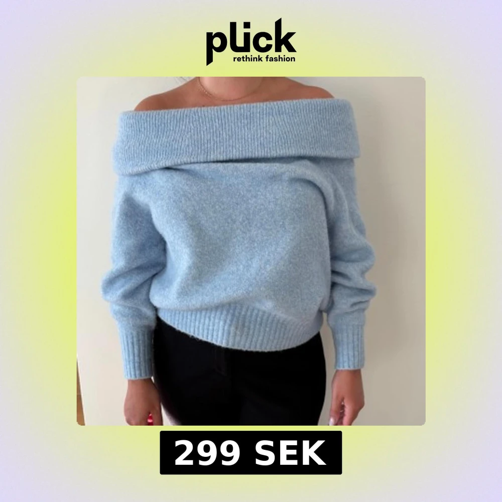 Supermysig ljusblå stickad tröja med bred offshoulder-krage som ger en chill och snygg vibe. Tröjan har ribbade muddar vid ärmslut och nederkant, perfekt för dig som gillar en lite loose passform och vill ha något som sticker ut.