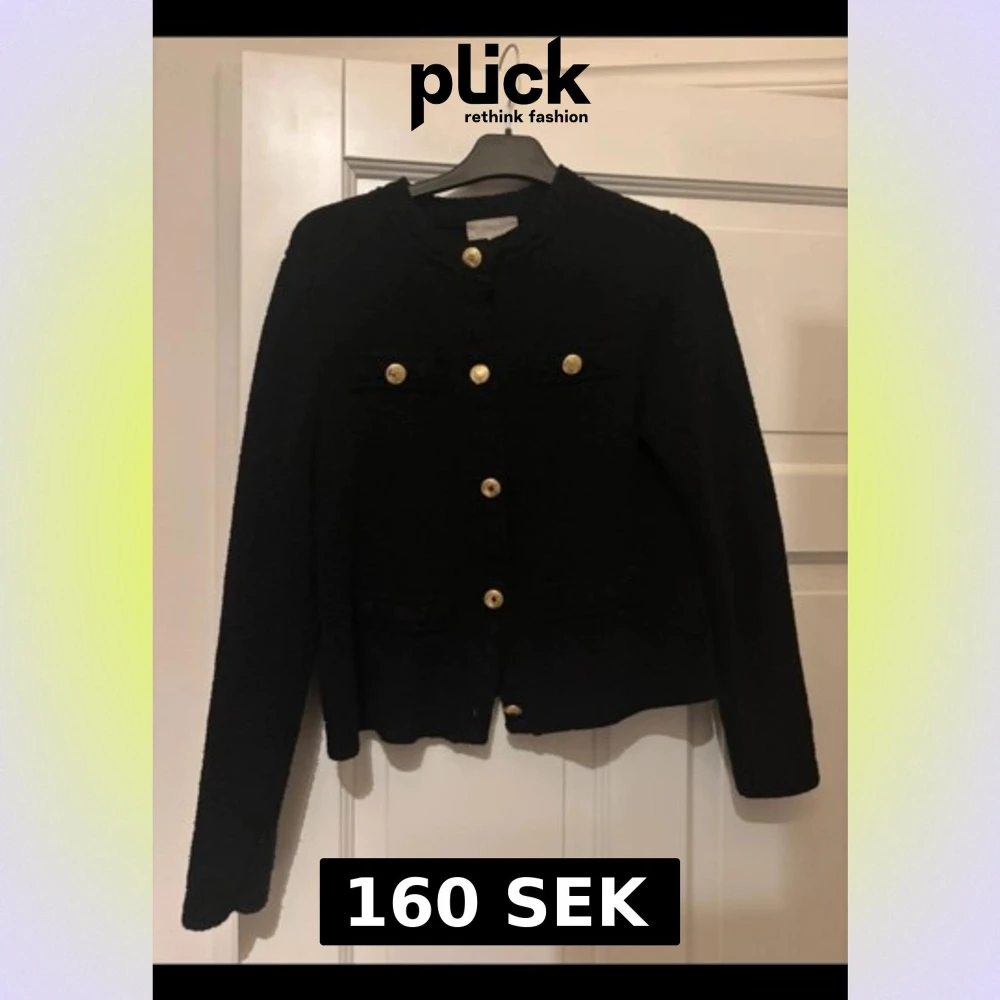 Stilren svart kofta från H&M med snygga guldknappar framtill och på fickorna. Koftan är stickad och har en rund halsringning samt långärmade ärmar. Perfekt för dig som gillar klassiska detaljer och vill ha en kofta som sticker ut lite extra.