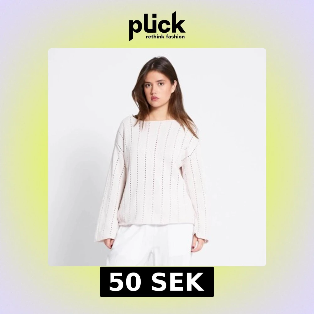 Superfin vit stickad tröja med diskret hålmönster i lodräta rader. Tröjan har en avslappnad passform, långa ärmar och rundad halsringning. Perfekt att slänga på sig för en chill och stilren look.