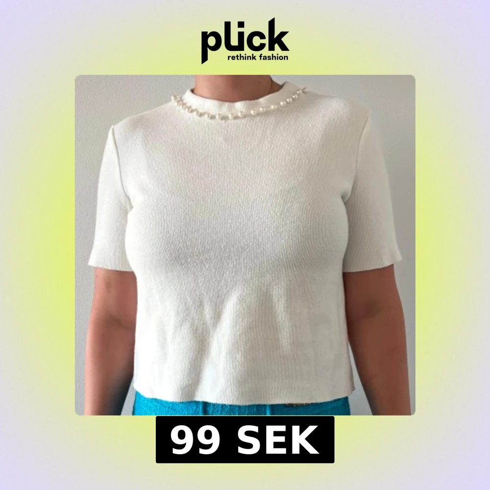 Vit stickad topp med korta ärmar och rund halsringning dekorerad med pärlor.