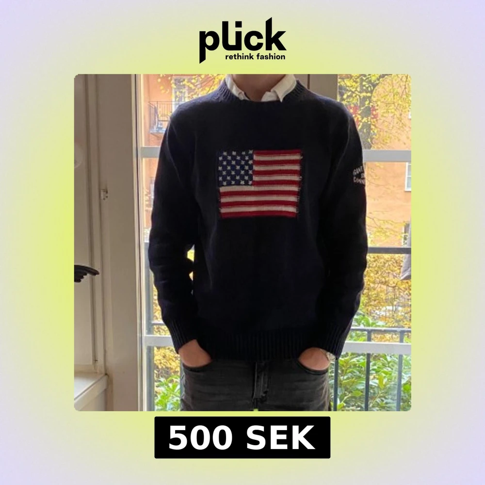 Mörkblå stickad tröja från Gant med amerikansk flagga broderad på bröstet och text på ena ärmen. Klassisk rund halsringning och ribbade muddar. Perfekt för höst och vinter