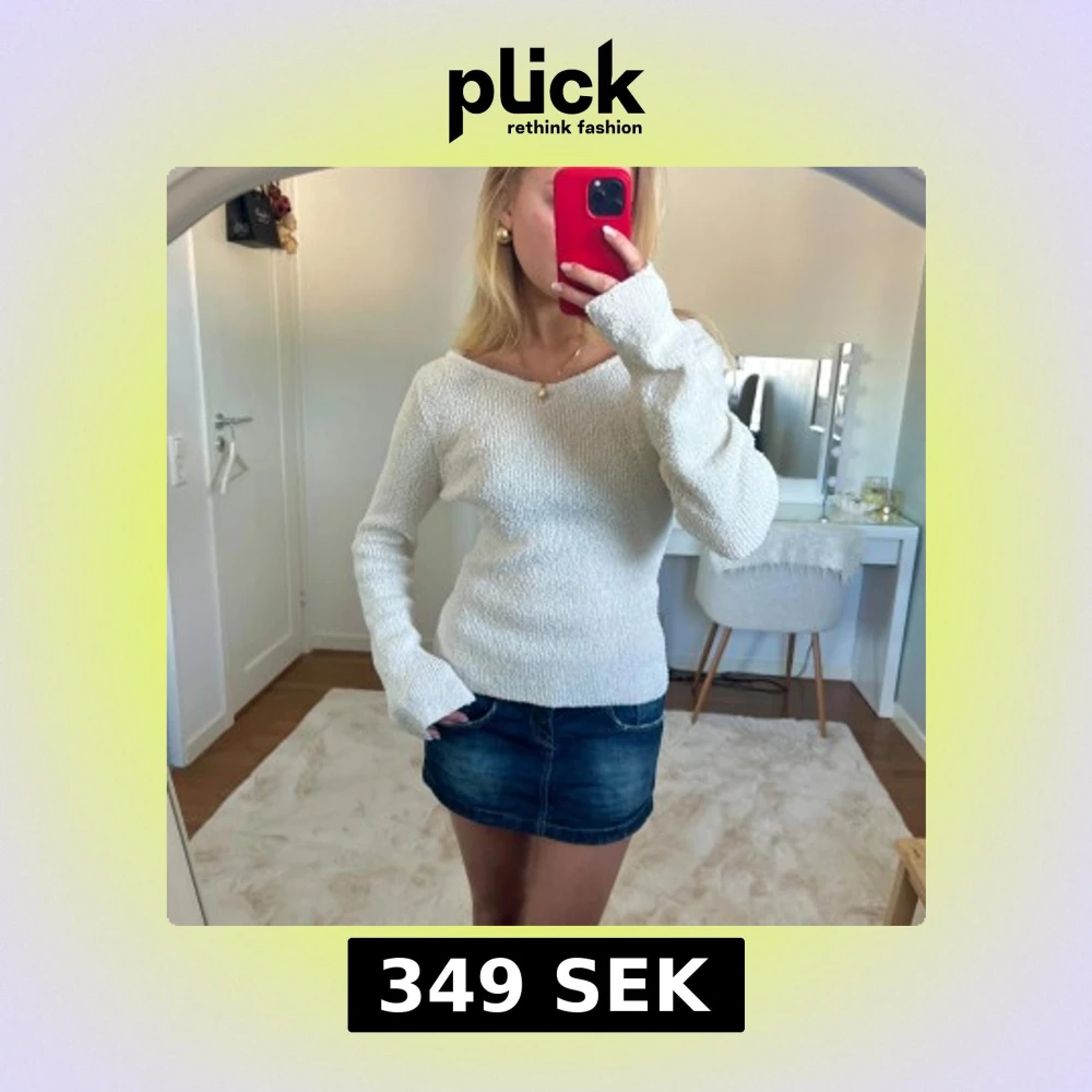 Säljer denna stilrena vit stickad tröja med lång ärm med slits och en v-ringad/halv-off-shoulder hals. Tröjan har en mjuk och bekväm passform. Den är i storlek m och slutsåld på h&m (säljs ej längre)