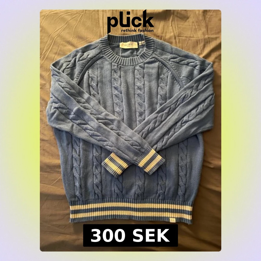 Tvär fet les deux stickad tröja i blå färg. Skicket är jättebra. Storlek L som passar alla från 180-187 ungefär. Priset kan diskuteras.