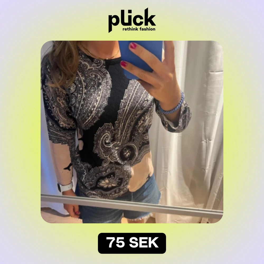 Fin stickad tröja med coolt mönster, lite udda men jag tycker den är cool, fin med ljusa jeans. Trekvartsärm. Ganska tunn.
