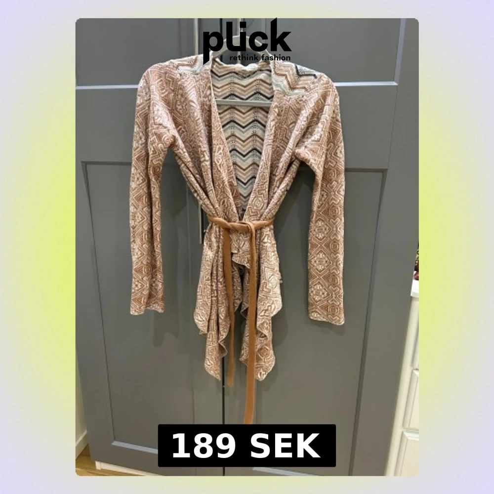 Säljer en beige och vit kofta från Odd Molly med snyggt geometriskt mönster och zigzag-stickning på ryggen. Koftan har långärmad passform, omlottstil och ett bälte i midjan. Materialet är stickat och känns mjukt och skönt.