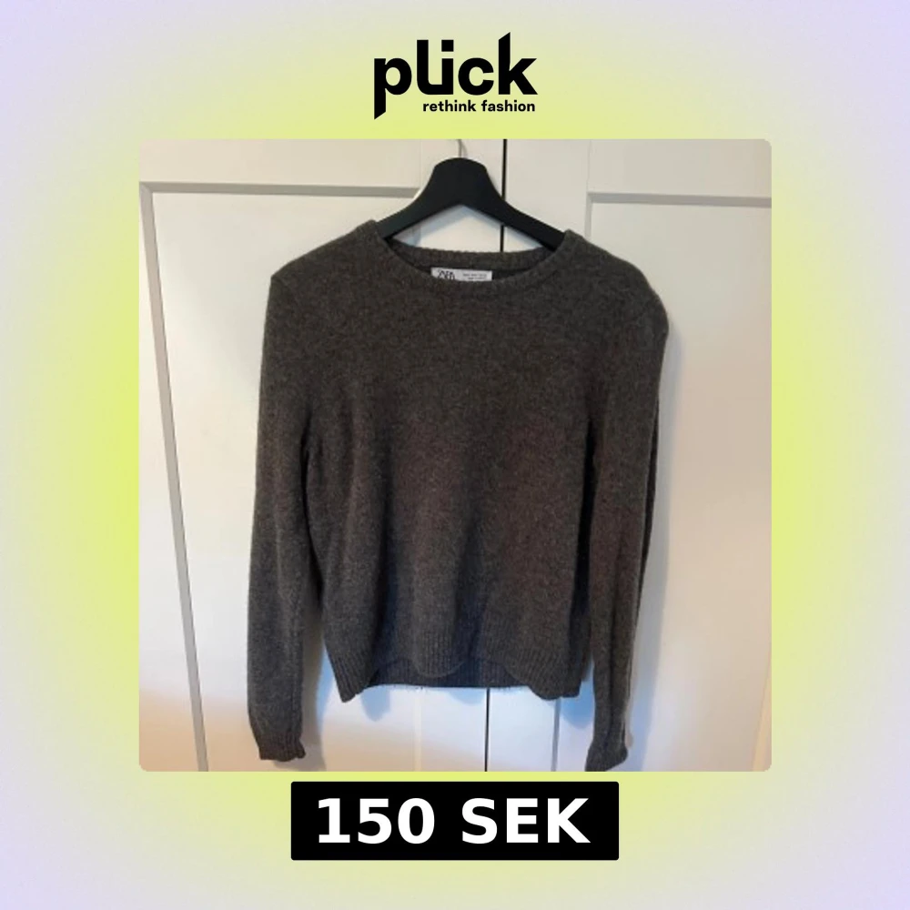Mysig mörkgrå stickad tröja från Zara med rund halsringning och långa ärmar. Perfekt för kyliga dagar och enkel att matcha med jeans eller kjol. Ribbstickade muddar vid ärmslut och nederkant ger en snygg finish.