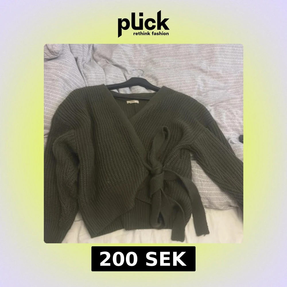 Säljer en olivgrön stickad omlottkofta från Moocci med knytband i midjan och djup v-ringning. Koftan har långa ärmar och grovstickad struktur som ger en mysig och trendig look. Perfekt att slänga på sig under kyliga dagar.