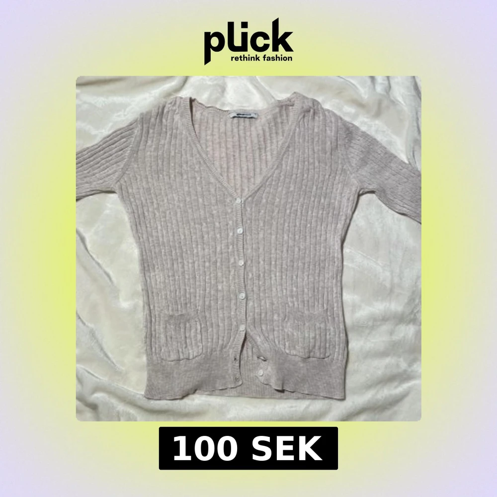 En tunn, beige kofta från Gina Tricot med små vita knappar. Etiketten säger storlek L men jag har vanligtvis XS och den passar perfekt.
