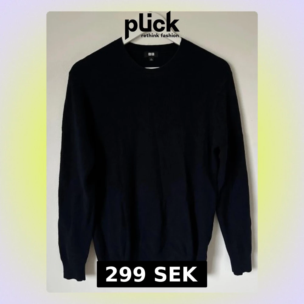 Mörkblå stickad tröja från Uniqlo i storlek L. Tröjan har rund hals och är långärmad med ribbade muddar. Materialet är en mjuk blandning av bomull och kashmir, vilket gör den extra skön och stilren. Perfekt för dig som gillar enkel och clean look. 5L17
