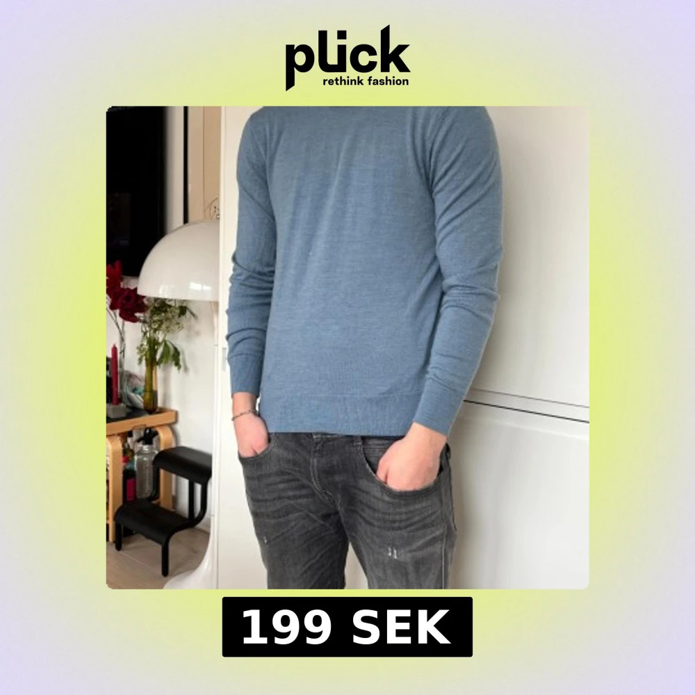 Säljer en stilren blå stickad tröja med rund halsringning. Tröjan har långa ärmar och ribbade muddar vid ärmslut och nederkant. Perfekt för en avslappnad look.