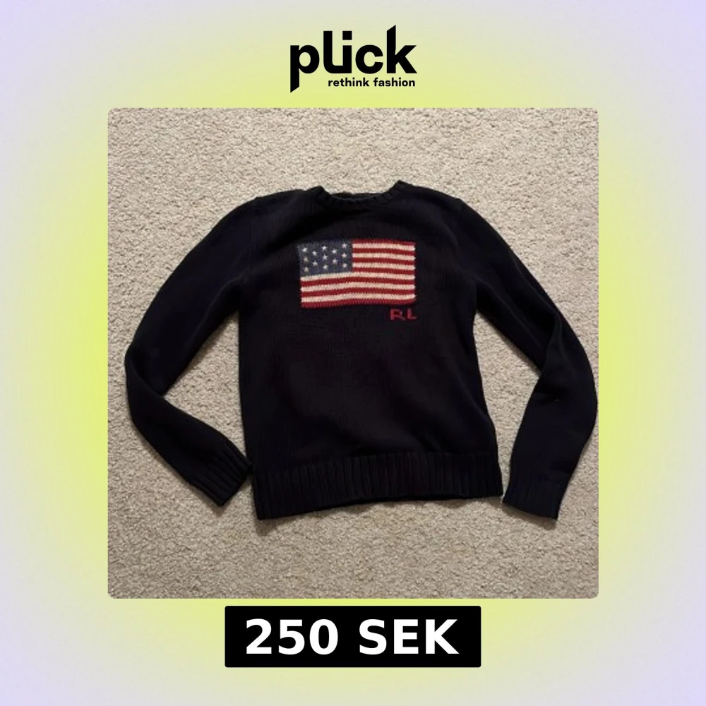 Snygg mörkblå stickad tröja från Polo Ralph Lauren med amerikansk flagga broderad på bröstet och RL-detalj i rött. Tröjan har långärmad passform, ribbade muddar och rund hals. Perfekt för dig som gillar klassisk stil med en twist. Tröjan är äkta och ser ut som ny!