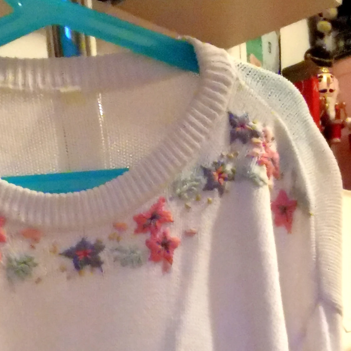 Fin stickad tröja köpt second hand men aldrig kommit till användning. Vacker broderi av blommor