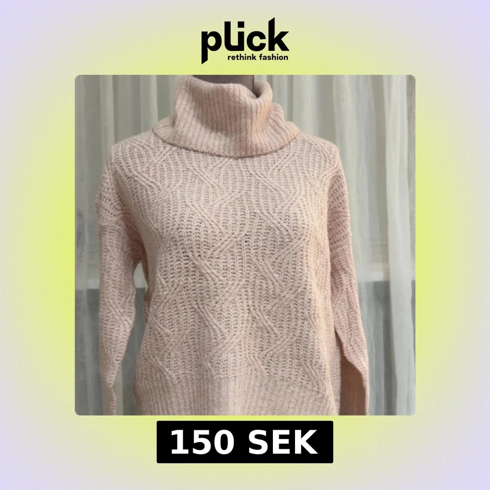 Säljer en baby rosa stickad polotröja med snyggt strukturmönster. Tröjan har hög krage och långa ärmar, perfekt för kyliga dagar. Den är ribbstickad vid kragen och nederkanten vilket ger en schysst detalj. Använt ett fåtal gånger.