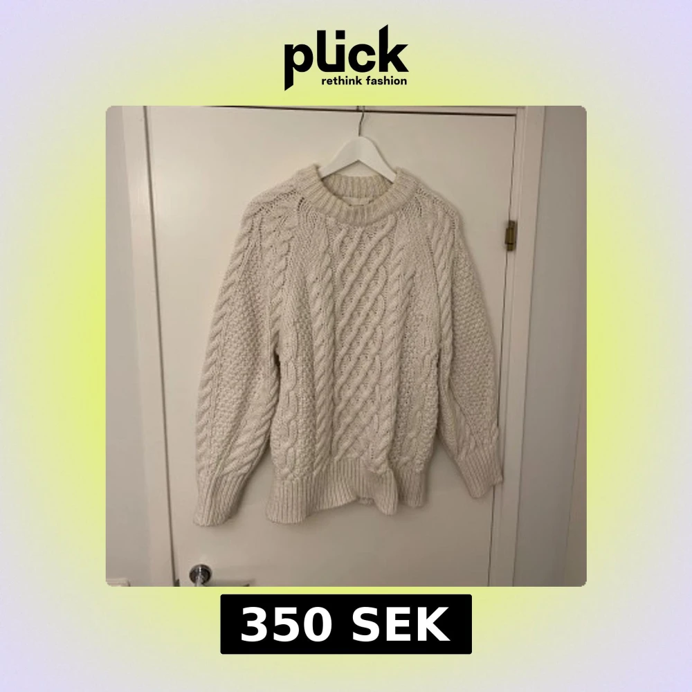 Säljer en chunky beige stickad tröja med grovt kabelmönster och bred ribbad kant vid hals, ärmslut och nederkant. Tröjan har långärmade och loose passform, perfekt för kyliga dagar. Materialet är mjukt och tjockt, vilket gör den extra mysig.