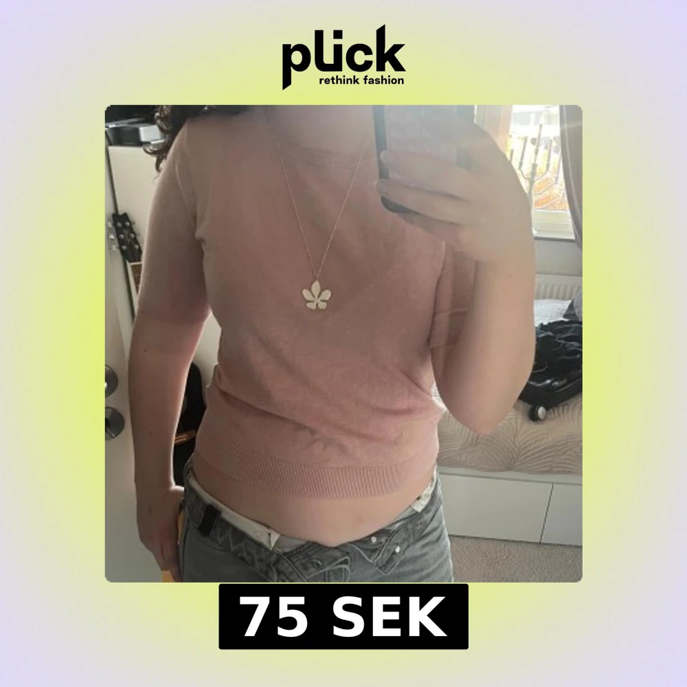 Säljer en söt rosa tröja med korta ärmar. Perfekt för vår och höst. Tröjan har en ribbad kant vid ärmslut och nederkant.