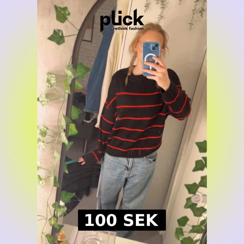 Säljer en svart stickad tröja med röda ränder. Tröjan har en loose passform, rund halsringning och långa ärmar. Perfekt för dig som gillar en chill och avslappnad stil.