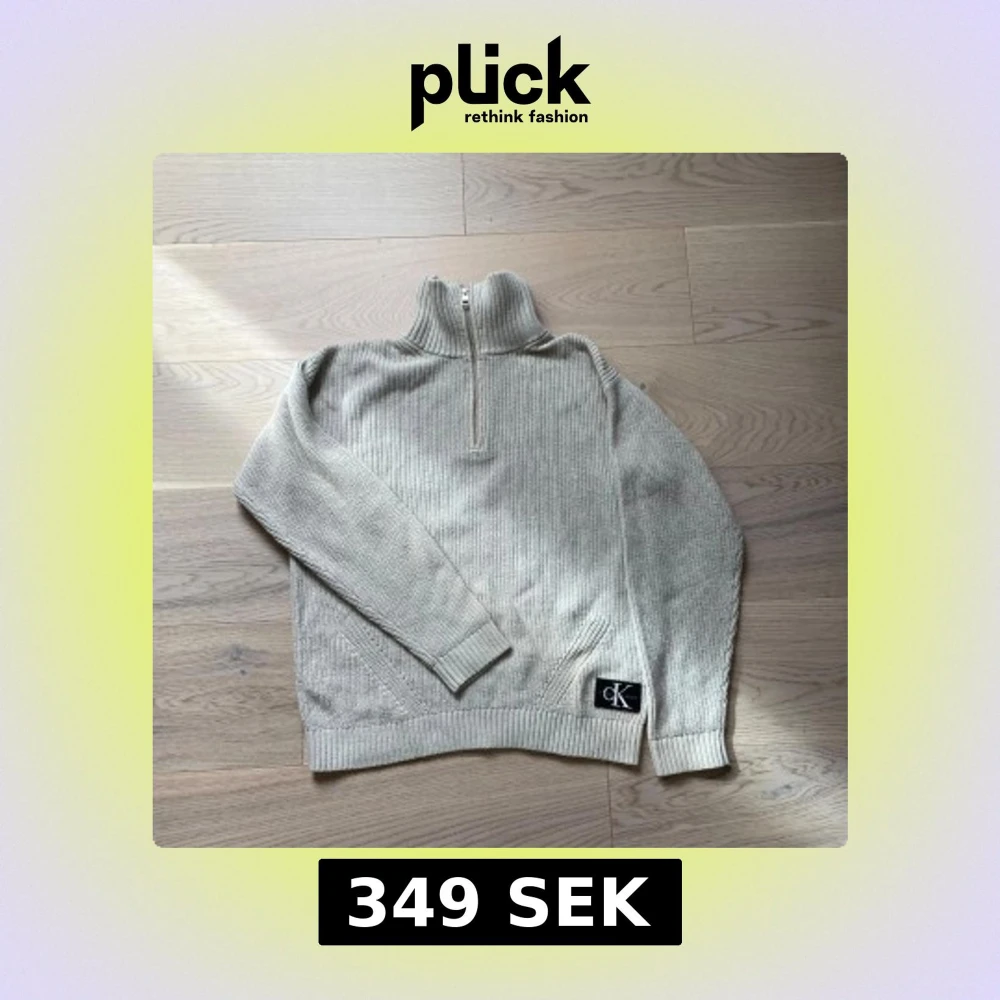 Säljer en stilren beige stickad tröja från Calvin Klein med halv dragkedja och hög krage. Tröjan har långa ärmar och ribbade muddar. Perfekt för våren. 🧥