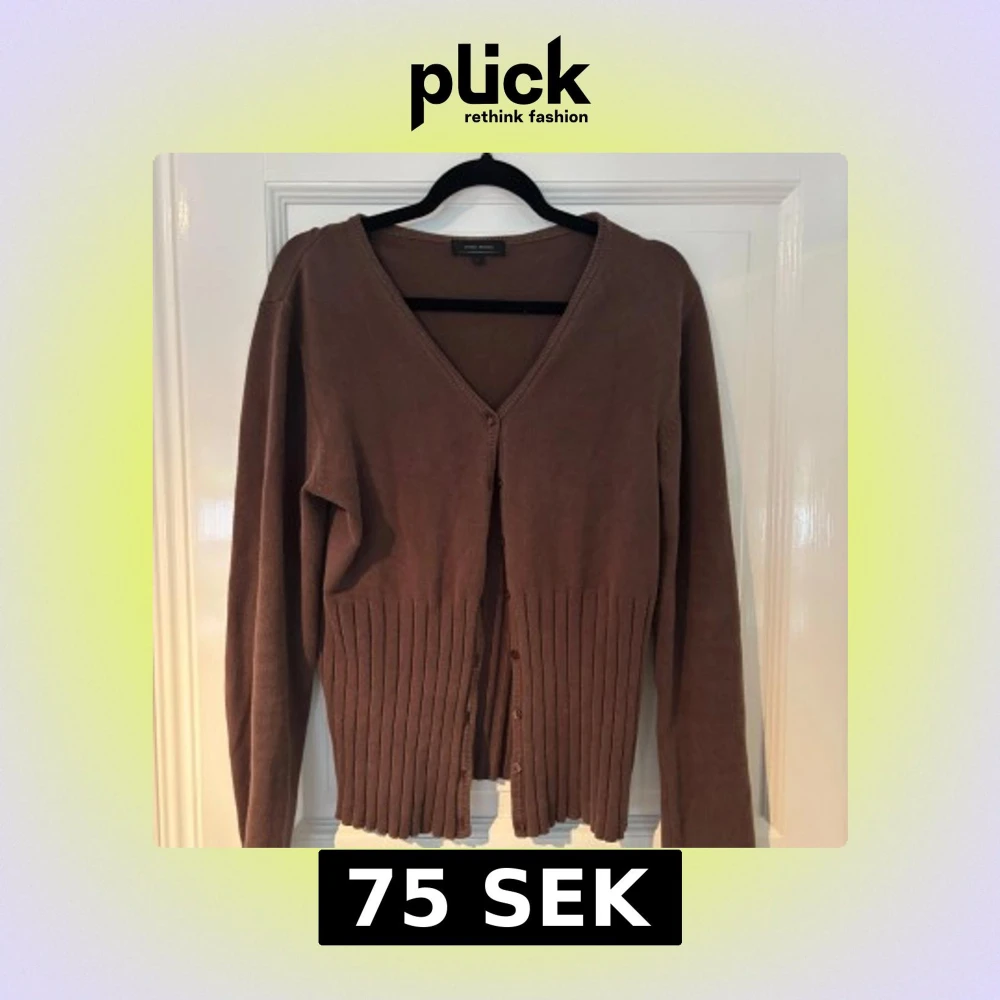Snygg brun kofta från Vero Moda i storlek L. Koftan har v-ringning, långa ärmar och knappar framtill. Nedre delen är ribbstickad vilket ger en cool detalj. Perfekt att slänga över en topp för en chill look.