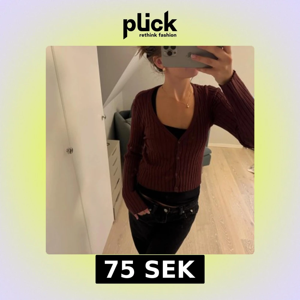 Säljer en vinröd ribbad kofta från Vero Moda i storlek M. Koftan har v-ringning, knappar framtill och är croppad i modellen. Långärmad och i mjukt, stretchigt material som sitter snyggt på kroppen. Perfekt att styla med jeans eller kjol.