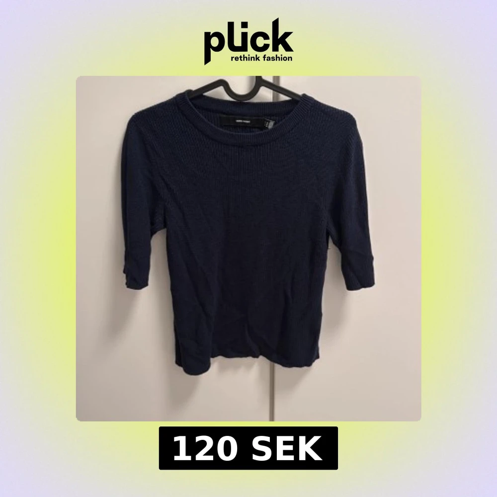 En stilren mörkblå stickad tröja från Vero Moda med ribbad struktur. Tröjan har rund halsringning och trekvartsärm, vilket gör den enkel att matcha med både jeans och kjol. Perfekt för dig som gillar en clean och klassisk look.
