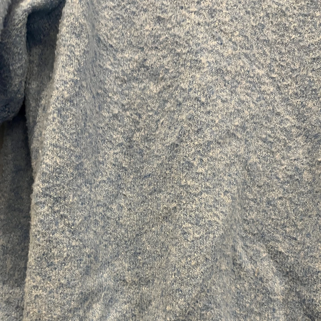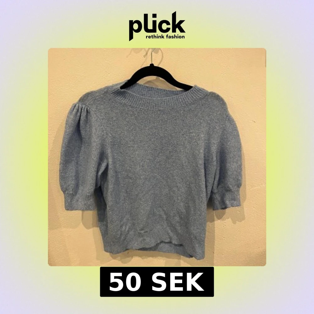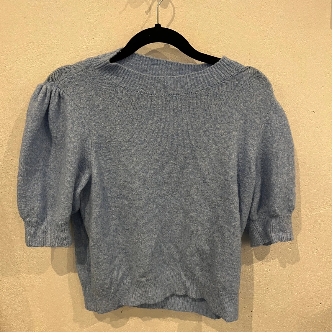 ljusblå stickad tröja med korta puffärmar och trekvart armar, bred ribbad kant vid halsen. Materialet är mjukt och känns riktigt skönt mot huden.