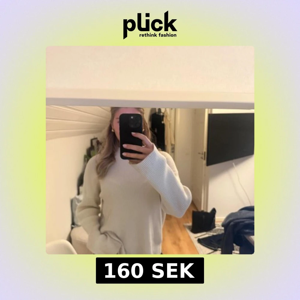 Säljer en vit ribbad stickad tröja med hög hals och långa ärmar. Tröjan har en loose fit och är perfekt för lager-på-lager. Den är enkel att matcha och har en clean vibe som funkar till allt.