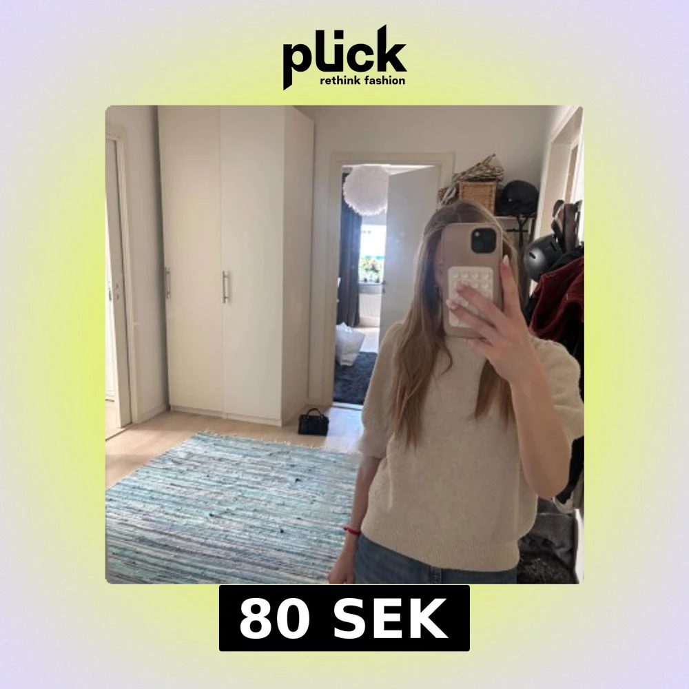 Superfin beige stickad tröja med puffiga halvlånga ärmar och ribbade muddar. Tröjan har en rund halsringning och är perfekt för dig som gillar en enkel men ändå trendig look. Passar snyggt till både jeans och kjol.