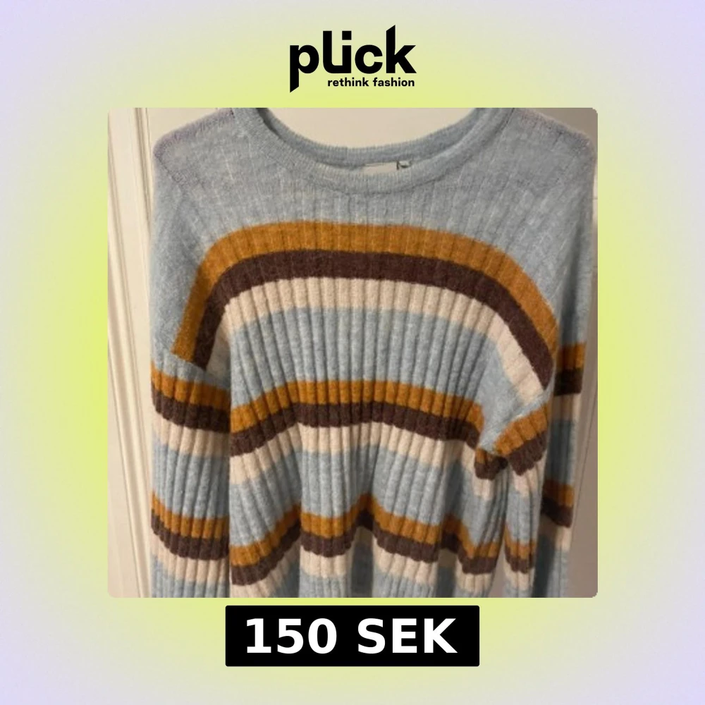 Superfin ribbstickad tröja med breda ränder i ljusblått, vitt, brunt och senapsgult. Tröjan har rund halsringning och långa ärmar. Perfekt för dig som gillar retrovibbar och mjuka material. Använd 2-3 gånger