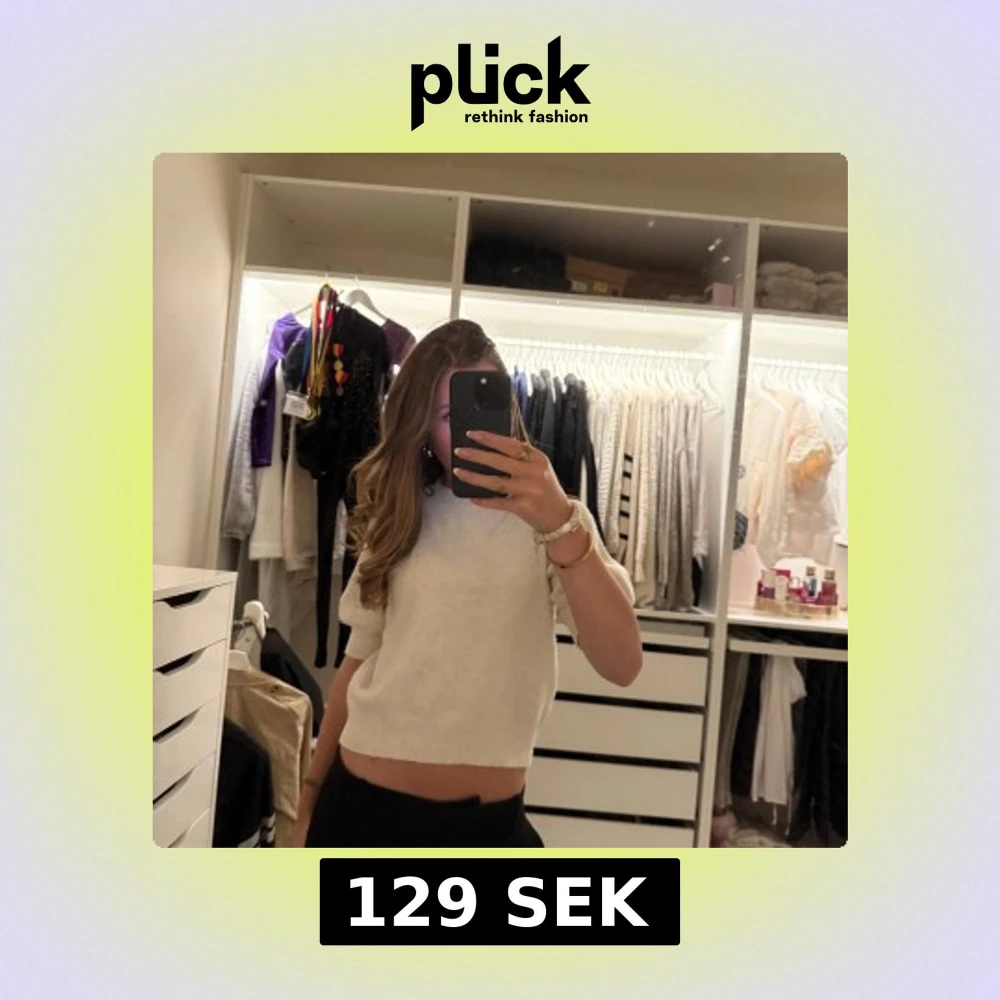 Säljer en mysig beige stickad tröja med puffiga ärmar och ribbade kanter. Perfekt för kyligare dagar och ger en stilren look. Passar bra till både jeans och kjol.