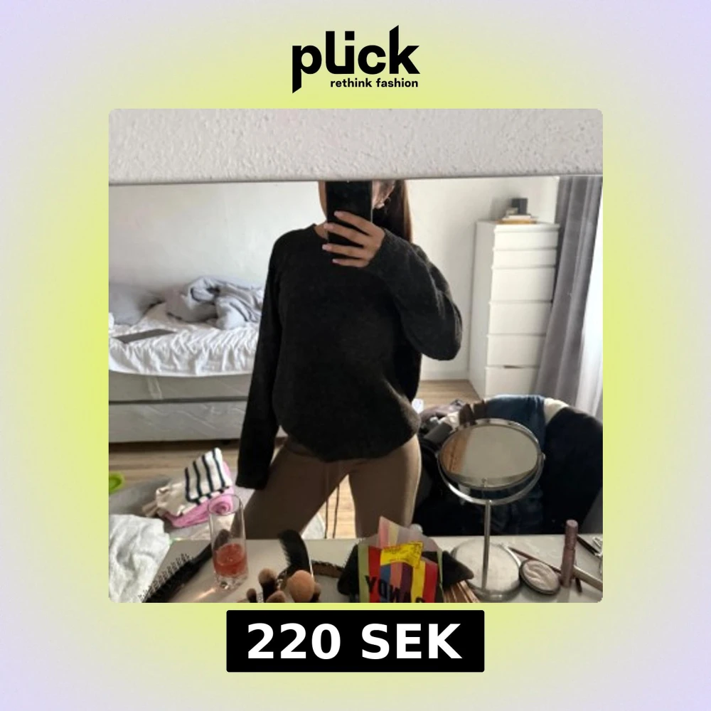 Säljer en mysig mörkgrå stickad tröja med långa ärmar. Perfekt för kyligare dagar och enkel att matcha med olika outfits.