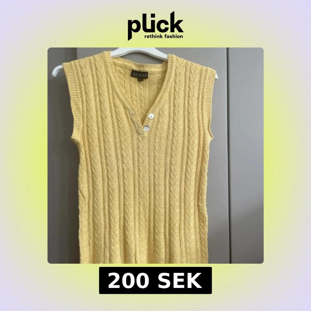 Snygg gul stickad topp från Vero Moda med kabelstickat mönster och v-ringning. Västen har två knappar framtill och är ärmlös, perfekt att styla över en skjorta eller t-shirt. Materialet är en mjuk mix av viskos och bomull.