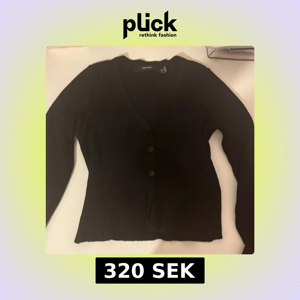 Svart kofta från Vero Moda i storlek S. Den har ribbad struktur, v-ringning och knäppning med fyra svarta knappar framtill. Långärmad och i mjukt stickat material som är skönt mot huden. Perfekt att slänga över en topp för en chill look.