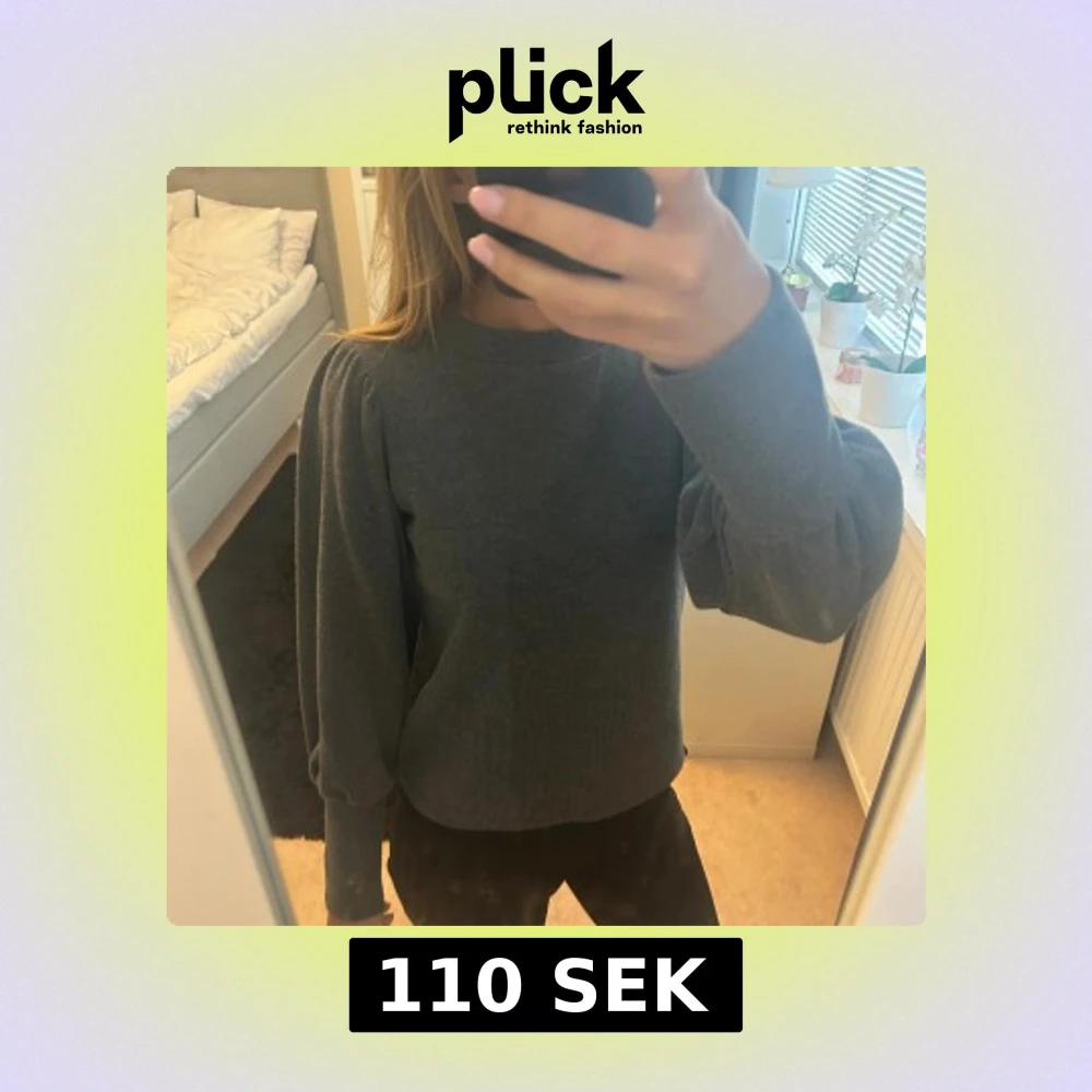 Mysig mörkgrå stickad tröja med puffiga långärmar och rund halsringning. Perfekt för kyligare dagar och enkel att matcha med både jeans och kjol. Stilren och enkel design som passar till många olika looks.