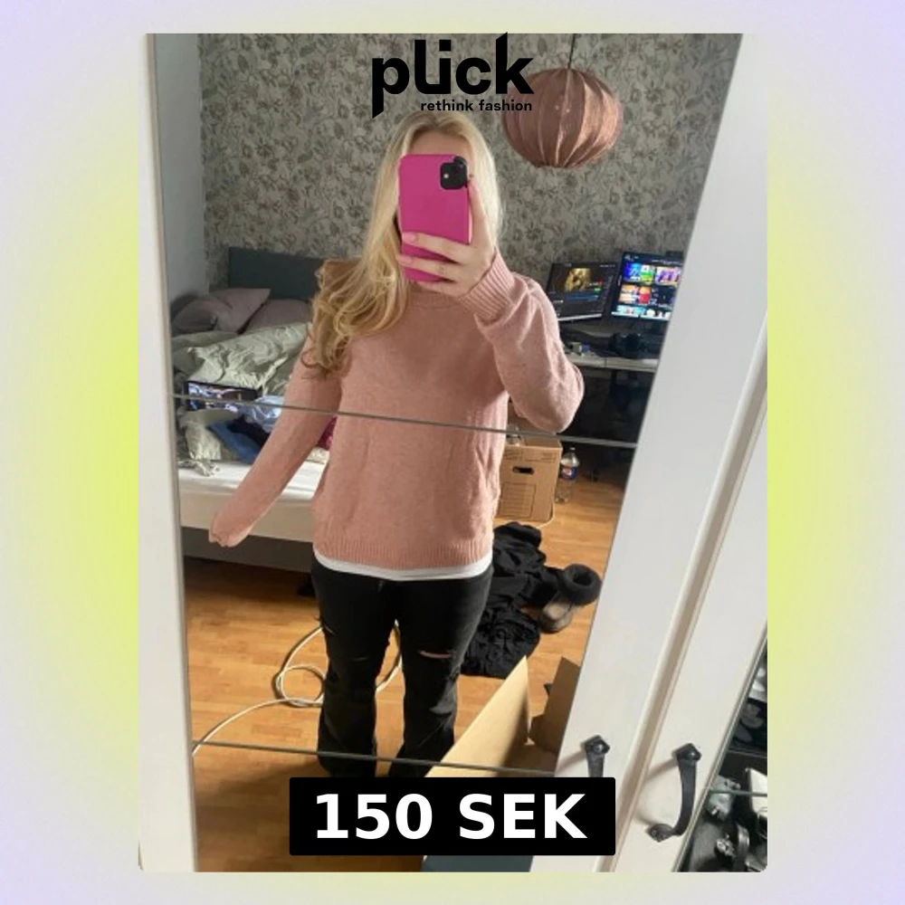 Mysig ljusrosa stickad tröja från Vila i storlek M. Tröjan har rund hals, ribbade muddar och lång ärm. Perfekt för lager på lager och enkel att matcha med jeans eller kjol.