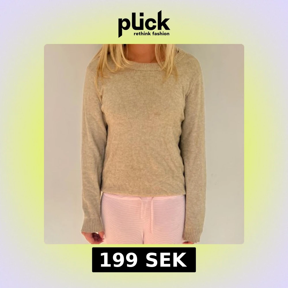 Säljer en enkel och stilren beige stickad tröja med rund hals och långa ärmar. Tröjan har ribbade muddar vid ärmslut, hals och längst ner på tröjan. På bilden är tröjan lite uppvikt längst ner.