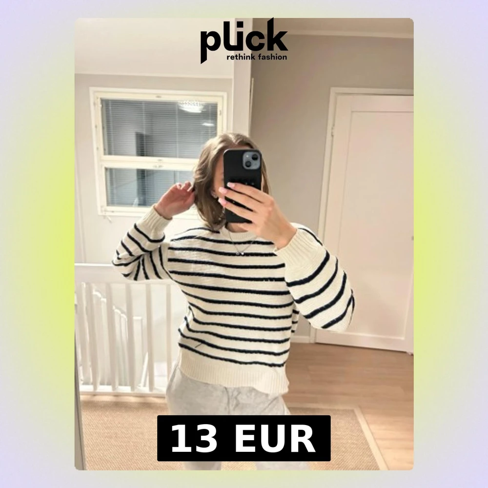 Säljer en mysig stickad tröja med vita och marinblå ränder. Tröjan har rund hals, ribbade muddar och en relaxed passform. Perfekt för lager-på-lager och chill dagar. Passar både till jeans och mjukisbyxor.