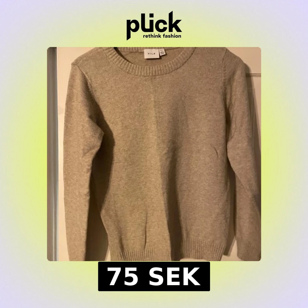 Säljer en stilren beige stickad tröja från Vila. Tröjan har en rund halsringning och långa ärmar med ribbade muddar vid ärmslut och nederkant. Perfekt för kyligare dagar!