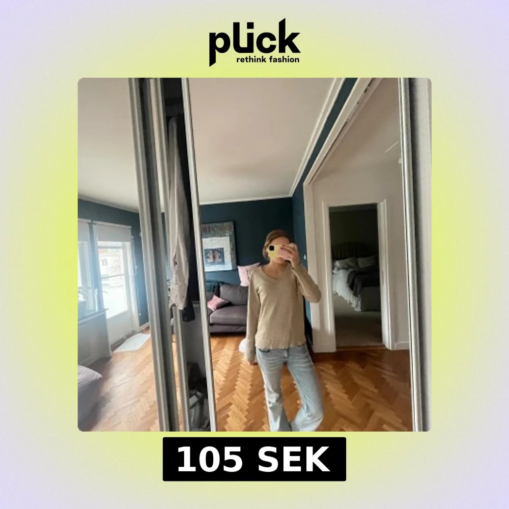 Säljer en enkel och stilren beige stickad tröja med v-ringning. Tröjan har långa ärmar och ribbade muddar vid ärmslut och nederkant. Perfekt för lager-på-lager och passar till jeans eller kjol.