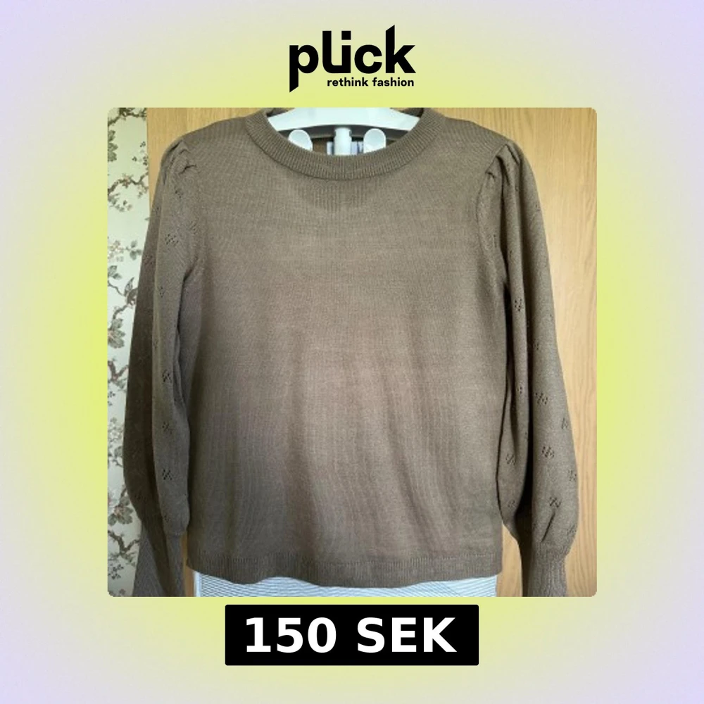 Säljer en beige stickad tröja från Vila med fina puffärmar och diskreta hålmönster på ärmarna. Tröjan har rund halsringning och långa ärmar, oanvänd.