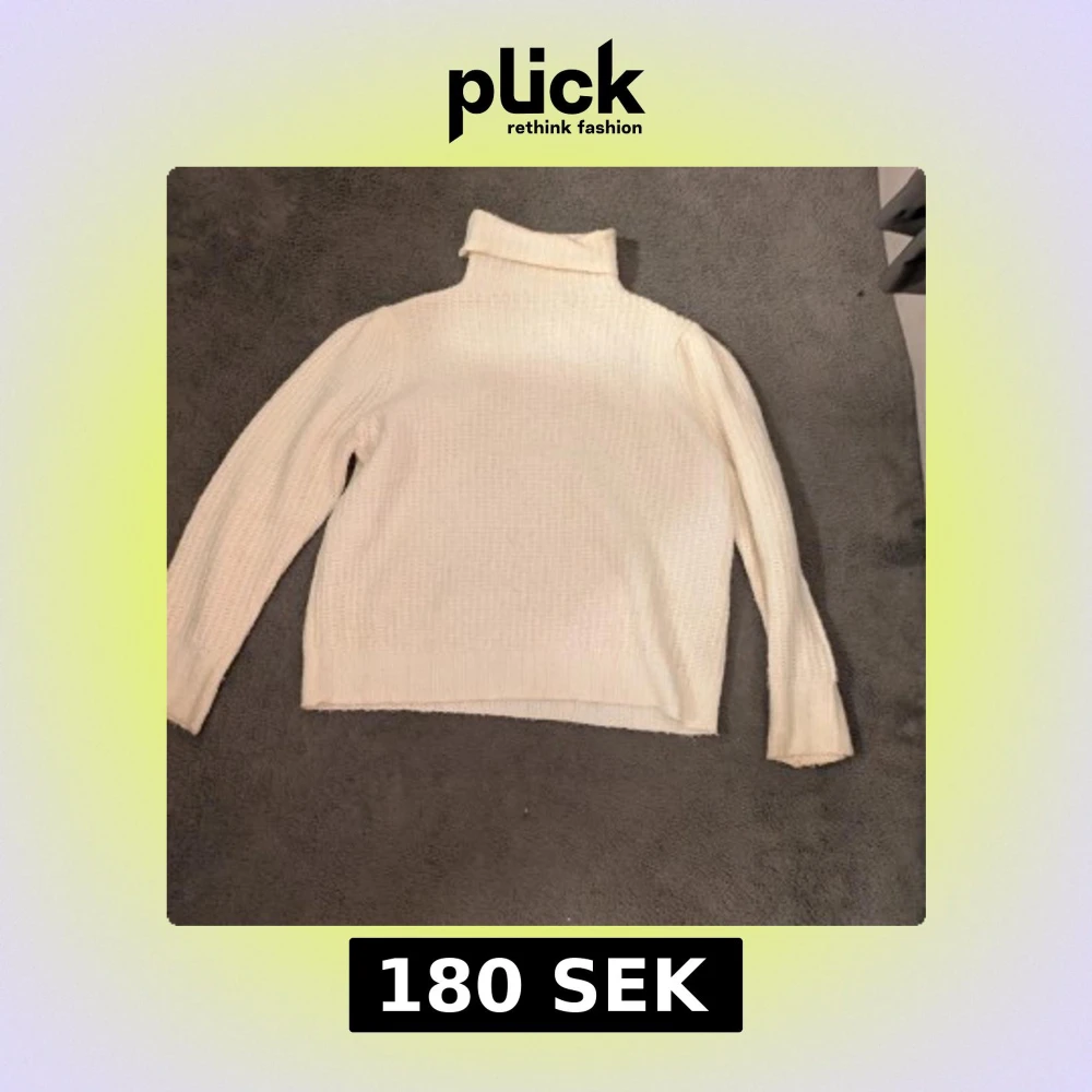 Säljer en vit stickad polotröja med hög krage och långärmad design. Tröjan har en mjuk och grovstickad struktur.