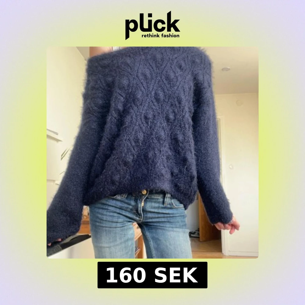 Säljer en mörkblå stickad tröja med fluffig yta och diskret mönster. Materialet är mjukt och värmande, passar dig som vill ha en mysig vibe.
